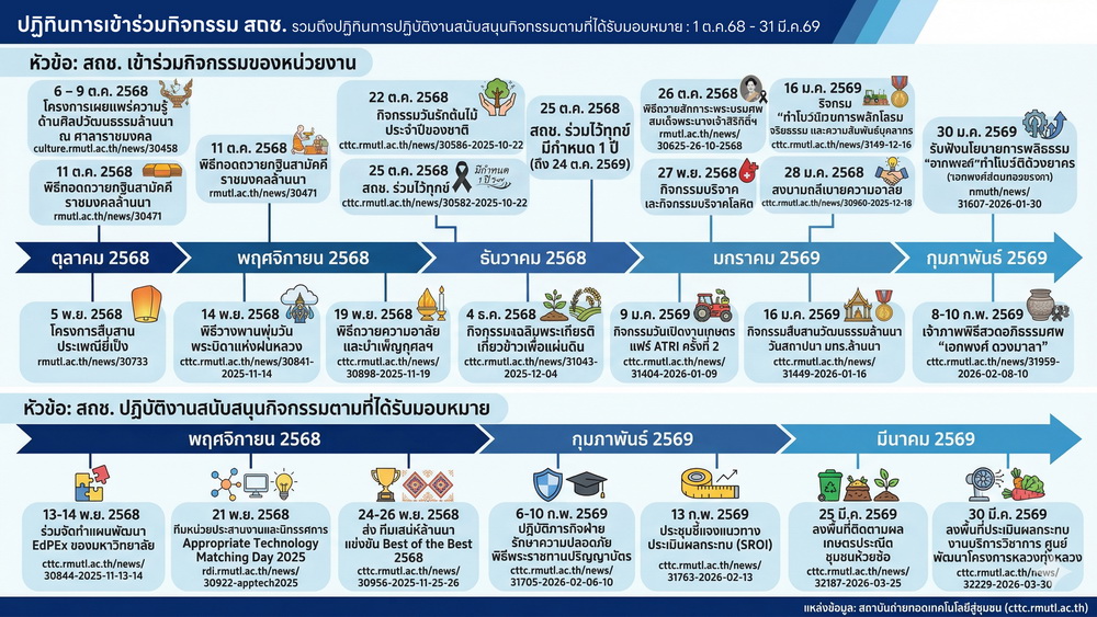 30 ม.ค. 2569: สถช. เข้าร่วมรับฟังนโยบายการพลิกโฉมมหาวิทยาลัยมุ่งเสริมพลังการขับเคลื่อนองค์กร (https://cttc.rmutl.ac.th/news/31607-2026-01-30)