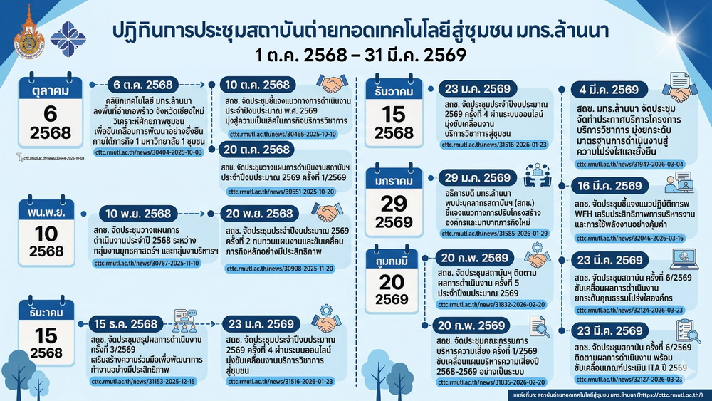 4 มี.ค. 2569: สถช. มทร.ล้านนา จัดประชุมจัดทำประกาศบริหารโครงการบริการวิชาการ มุ่งยกระดับมาตรฐานการดำเนินงานสู่ความโปร่งใสและยั่งยืน (https://cttc.rmutl.ac.th/news/31947-2026-03-04)