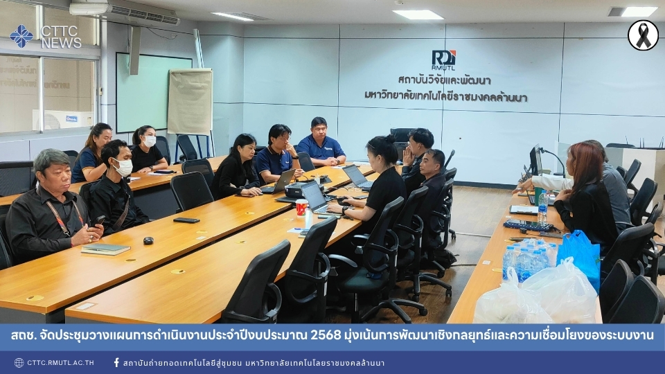 วันที่ 10 พฤศจิกายน 2568 สถาบันถ่ายทอดเทคโนโลยีสู่ชุมชน มหาวิทยาลัยเทคโนโลยีราชมงคลล้านนา โดยกลุ่มงานยุทธศาสตร์การนำไปใช้ประโยชน์ ร่วมกับกลุ่มงานบริหารและการขับเคลื่อนงานสนับสนุน ได้จัดการประชุมเพื่อวางแผนการดำเนินงานประจำปีงบประมาณ พ.ศ. 2568 ณ ห้องประชุมนพรัตน์ สถาบันวิจัยและพัฒนา มหาวิทยาลัยเทคโนโลยีราชมงคลล้านนา (ดอยสะเก็ด) โดยมี อาจารย์ศรีธร อุปคำ รองผู้อำนวยการฝ่ายยุทธศาสตร์การนำไปใช้ประโยชน์ และผู้ช่วยศาสตราจารย์ ดร.ธัญวดี สุจริตธรรม รองผู้อำนวยการฝ่ายบริหารและการขับเคลื่อนงานสนับสนุน พร้อมด้วยบุคลากรจากทั้งสองกลุ่มงานเข้าร่วมประชุม