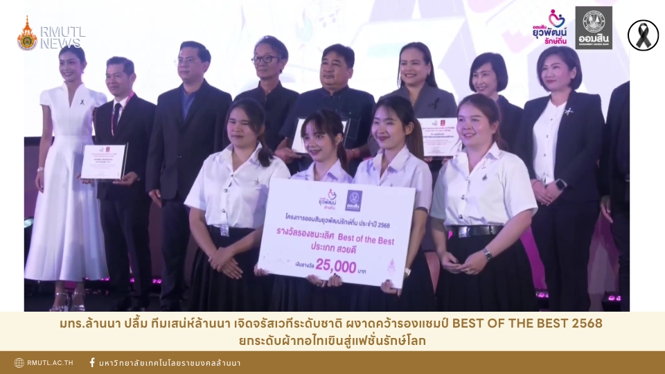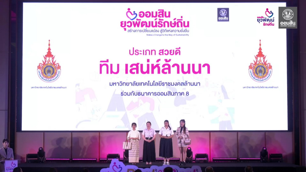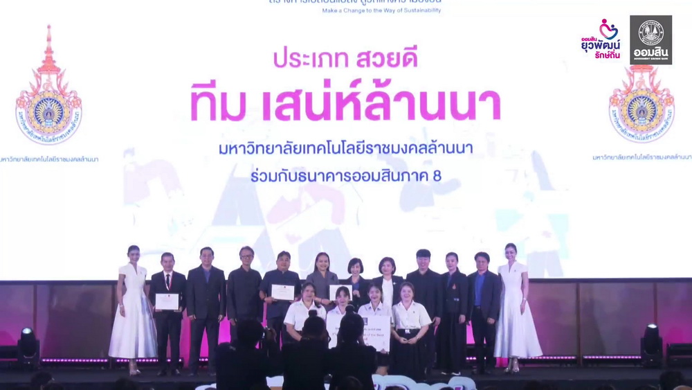เมื่อวันที่ 26 พฤศจิกายน 2568 ณ หอประชุมไฮเดรนเยีย โรงแรมทีเค พาเลส กรุงเทพมหานคร บรรยากาศเต็มไปด้วยความคึกคักและเสียงเชียร์ เมื่อ นางสาววชิรา การสุทธิ์ รองผู้อำนวยการธนาคารออมสิน กลุ่มการตลาดเพื่อความยั่งยืน ให้เกียรติเป็นประธานมอบโล่เกียรติยศและเงินรางวัลมูลค่า 25,000 บาท ให้แก่ ทีมเสน่ห์ล้านนา จาก มทร.ล้านนา ที่สามารถฝ่าด่านการคัดเลือกกว่า 342 ทีมทั่วประเทศ ทะลุเข้าสู่รอบ 12 ทีมสุดท้าย และผงาดคว้ารางวัลรองชนะเลิศ ในประเภท สวยดี (โดยรางวัลชนะเลิศรับเงินรางวัล 50,000 บาท) ถือเป็นเครื่องการันตีฝีมือของเด็กราชมงคลที่ไม่เป็นสองรองใคร