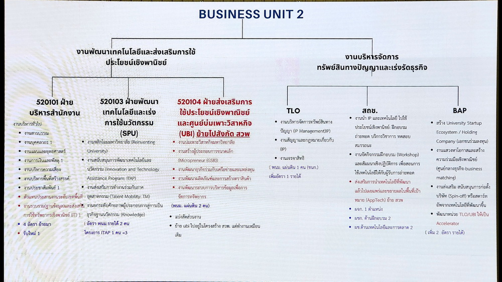นอกจากนี้ ที่ประชุมยังหารือประเด็นสำคัญด้านการบริหารจัดการบุคลากร โดยมีแนวทางให้ “ย้ายทะเบียนบ้าน” ไปสังกัดหน่วยงานกลาง เช่น สถาบันวิจัยและพัฒนา หรือคณะต่าง ๆ เพื่อรักษาสถานะการเป็นพนักงานเงินงบประมาณแผ่นดิน แต่ยังสามารถปฏิบัติงานจริงใน BU2 ได้ตามเดิม ซึ่งประเด็นนี้ก่อให้เกิดข้อห่วงกังวลของบุคลากรในด้านความมั่นคงในตำแหน่ง ความก้าวหน้าในสายงาน และภาระด้านการหารายได้ในอนาคต
