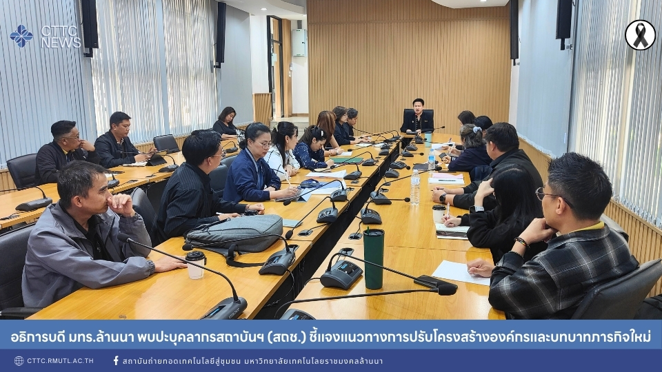 เมื่อวันที่ 29 มกราคม พ.ศ. 2569 ผู้ช่วยศาสตราจารย์ ดร.อรรณพ ทัศนอุดม รักษาราชการแทนอธิการบดี มหาวิทยาลัยเทคโนโลยีราชมงคลล้านนา เป็นประธานการประชุม “อธิการบดีพบหน่วยงานในสังกัด” กรณี สถาบันถ่ายทอดเทคโนโลยีสู่ชุมชน (สถช.) ณ ห้องประชุมลีลาวดี ชั้น 1 สำนักงานอธิการบดี เพื่อชี้แจงแนวทางการปรับโครงสร้างองค์กรใหม่ และรับฟังความคิดเห็นจากบุคลากรในหน่วยงาน