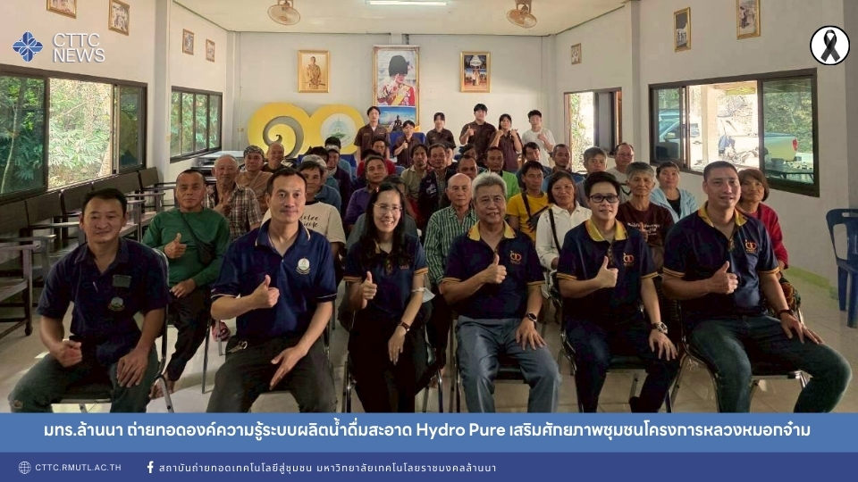 ระหว่างวันที่ 18–20 กุมภาพันธ์ พ.ศ. 2569 สถาบันถ่ายทอดเทคโนโลยีสู่ชุมชน ร่วมกับกลุ่มแผนงานใต้ร่มพระบารมีฯ ของ มหาวิทยาลัยเทคโนโลยีราชมงคลล้านนา ลงพื้นที่จัดกิจกรรมอบรมถ่ายทอดองค์ความรู้เกี่ยวกับระบบกรองน้ำ Hydro Pure พร้อมให้บริการน้ำดื่มผ่านรถผลิตน้ำดื่มเคลื่อนที่ ณ ศูนย์พัฒนาโครงการหลวงหมอกจ๋าม ตำบลท่าตอน อำเภอแม่อาย จังหวัดเชียงใหม่ โดยมี นายอรรณนพ เปรมัษเฐียร หัวหน้าศูนย์พัฒนาโครงการหลวงหมอกจ๋าม ให้การต้อนรับคณะดำเนินงาน