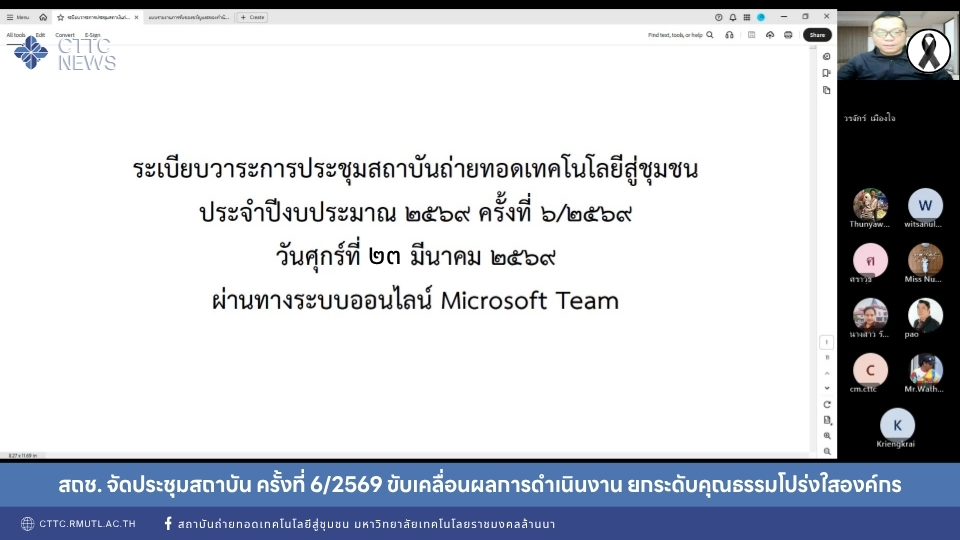 สถาบันถ่ายทอดเทคโนโลยีสู่ชุมชน (สถช.) มหาวิทยาลัยเทคโนโลยีราชมงคลล้านนา จัดการประชุมบุคลากรประจำปีงบประมาณ 2569 ครั้งที่ 6/2569 ผ่านระบบออนไลน์ Microsoft Teams เมื่อวันที่ 23 มีนาคม 2569 โดยมี ผู้ช่วยศาสตราจารย์วรจักร์ เมืองใจ ผู้อำนวยการสถาบันถ่ายทอดเทคโนโลยีสู่ชุมชน เป็นประธานการประชุม พร้อมด้วยคณะผู้บริหารและบุคลากรของสถาบันเข้าร่วมอย่างพร้อมเพรียง เพื่อติดตามความก้าวหน้าผลการดำเนินงาน และกำหนดทิศทางการขับเคลื่อนภารกิจของหน่วยงานให้บรรลุเป้าหมายตามยุทธศาสตร์ของมหาวิทยาลัย