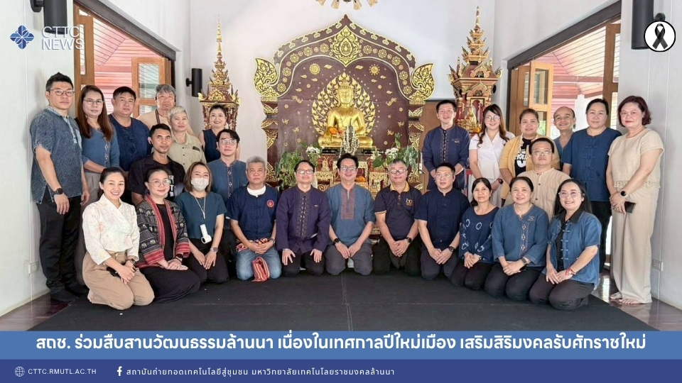 วันพฤหัสบดีที่ 9 เมษายน 2569 สถาบันถ่ายทอดเทคโนโลยีสู่ชุมชน นำโดย ผศ. มนตรี เงาเดช รองผู้อำนวยการสถาบันถ่ายทอดเทคโนโลยีสู่ชุมชน ฝ่ายยุทธศาสตร์ความยั่งยืน เป็นตัวแทนคณะผู้บริหารของสถาบันฯ พร้อมด้วยบุคลากรในสังกัด เข้าร่วมกิจกรรมสืบสานวัฒนธรรมล้านนา เนื่องในเทศกาลประเพณีปีใหม่เมือง ซึ่งจัดขึ้นโดยสถาบันวิจัยและพัฒนา มหาวิทยาลัยเทคโนโลยีราชมงคลล้านนา ณ อาคารศูนย์วิจัย พัฒนา ภูมิปัญญาและผลิตภัณฑ์ท้องถิ่น (สถาบันถ่ายทอดเทคโนโลยีสู่ชุมชน), สถาบันวิจัยและพัฒนา อาคาร C2 ชั้น 2 มหาวิทยาลัยเทคโนโลยีราชมงคลล้านนา (ดอยสะเก็ด)