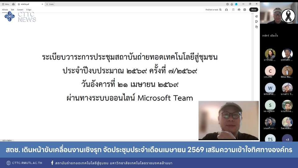 สถาบันถ่ายทอดเทคโนโลยีสู่ชุมชน มหาวิทยาลัยเทคโนโลยีราชมงคลล้านนา เดินหน้าขับเคลื่อนภารกิจเชิงรุกอย่างต่อเนื่อง จัดการประชุมสถาบันถ่ายทอดเทคโนโลยีสู่ชุมชน ประจำเดือนเมษายน ประจำปีงบประมาณ 2569 ครั้งที่ 7/2569 เมื่อวันอังคารที่ 21 เมษายน 2569 เวลา 09.00-12.00 น. ในรูปแบบออนไลน์ผ่านระบบ Microsoft Teams โดยมี ผู้ช่วยศาสตราจารย์ ดร.วรจักร์ เมืองใจ ผู้อำนวยการสถาบันถ่ายทอดเทคโนโลยีสู่ชุมชน เป็นประธานการประชุม พร้อมด้วยบุคลากรของสถาบันเข้าร่วมอย่างพร้อมเพรียง สะท้อนพลังความร่วมมือขององค์กรในการขับเคลื่อนงานสู่เป้าหมายเดียวกัน