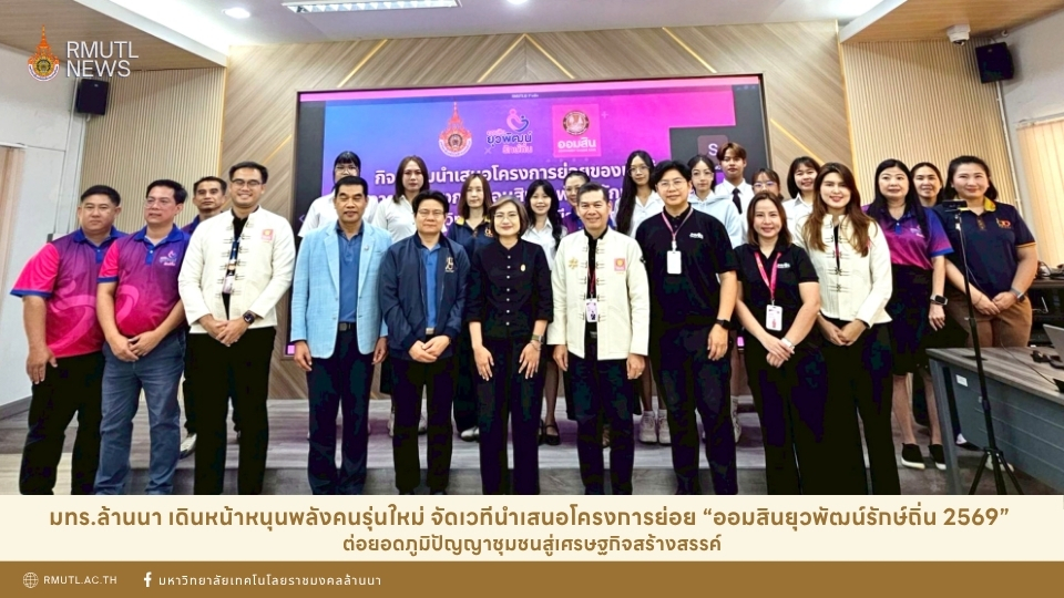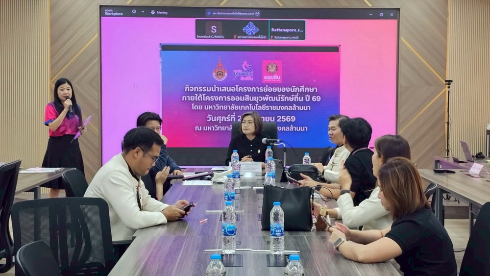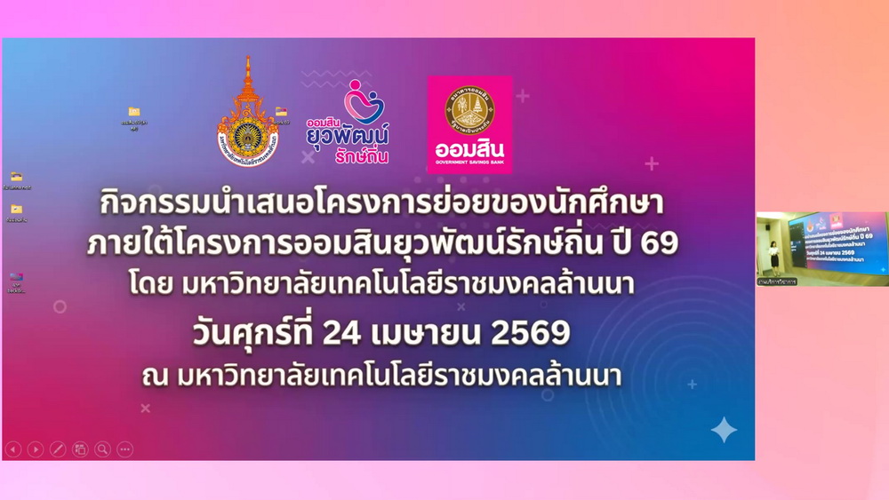 วันศุกร์ที่ 24 เมษายน 2569 มหาวิทยาลัยเทคโนโลยีราชมงคลล้านนา จัดกิจกรรมนำเสนอโครงการย่อยของนักศึกษา ภายใต้โครงการ ออมสินยุวพัฒน์รักษ์ถิ่น ประจำปี 2569 ณ ห้องประชุมลีลาวดี อาคารอำนวยการ มหาวิทยาลัยเทคโนโลยีราชมงคลล้านนา พร้อมเชื่อมโยงการประชุมผ่านระบบออนไลน์กับผู้ทรงคุณวุฒิจาก ธนาคารออมสิน ส่วนกลาง เพื่อร่วมพิจารณาและให้ข้อเสนอแนะแก่ทีมนักศึกษาอย่างใกล้ชิด