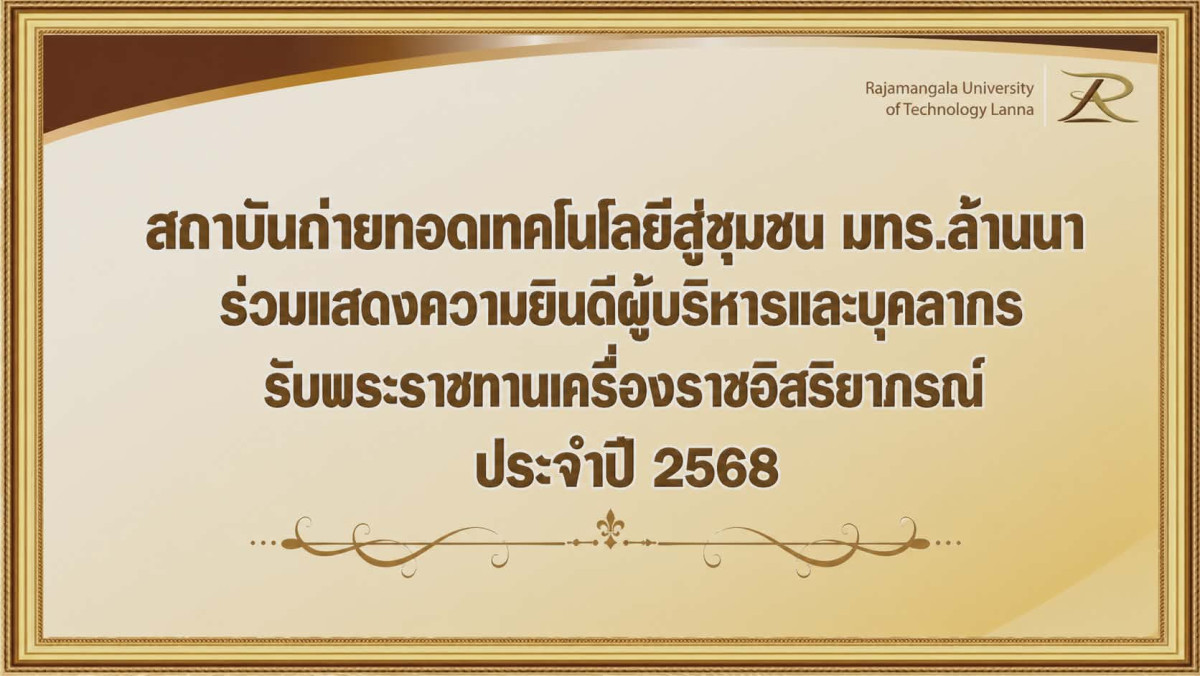 สถาบันถ่ายทอดเทคโนโลยีสู่ชุมชน มหาวิทยาลัยเทคโนโลยีราชมงคลล้านนา ขอร่วมแสดงความยินดีอย่างยิ่งแก่ผู้บริหารและบุคลากรในสังกัด ที่ได้รับพระราชทานเครื่องราชอิสริยาภรณ์อันเป็นที่เชิดชูยิ่งช้างเผือก และเครื่องราชอิสริยาภรณ์อันมีเกียรติยศยิ่งมงกุฎไทย ชั้นต่ำกว่าสายสะพาย เนื่องในโอกาสพระราชพิธีเฉลิมพระชนมพรรษา 28 กรกฎาคม 2568 ซึ่งนับเป็นเกียรติยศสูงสุดแก่ผู้ปฏิบัติราชการด้วยความวิริยะ อุตสาหะ และอุทิศตนเพื่อประโยชน์ส่วนรวม